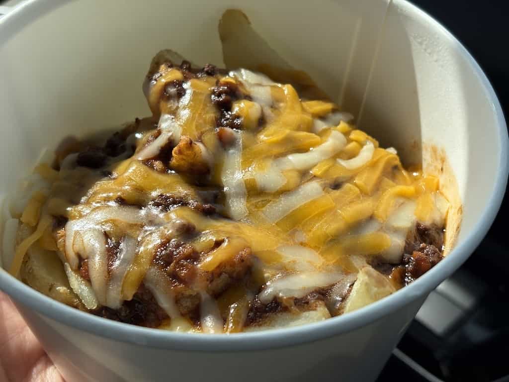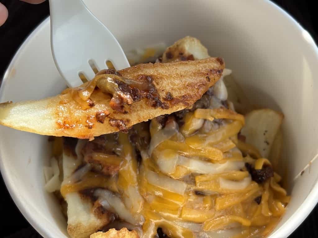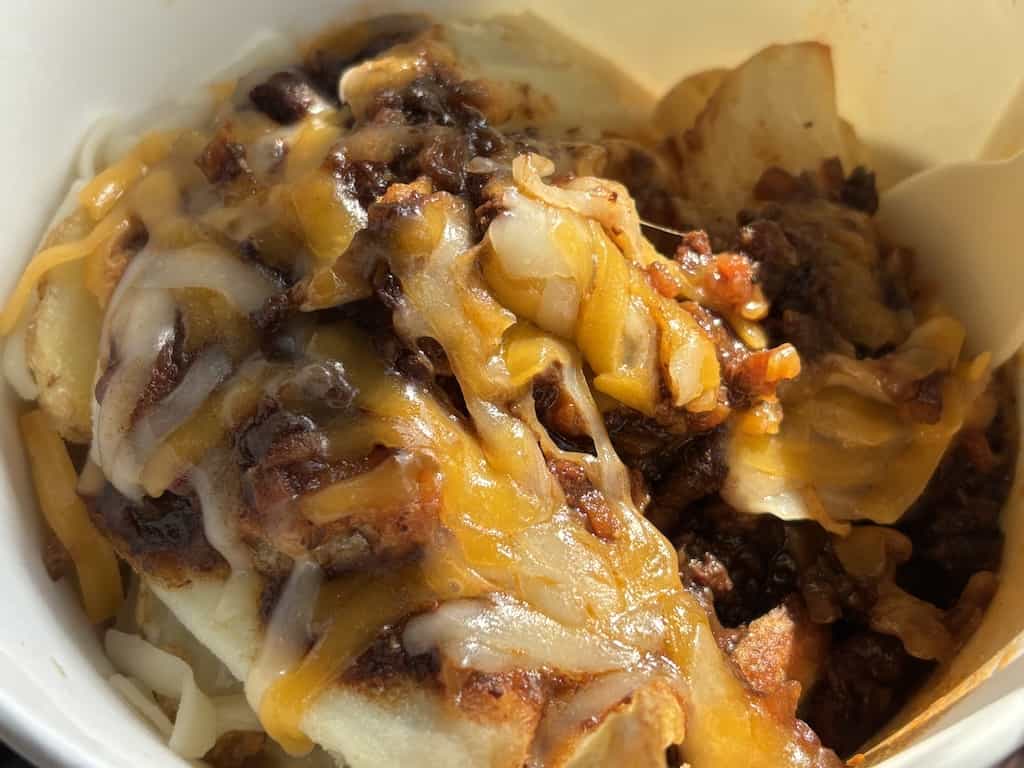 2026年3月、コストコ東近江倉庫店のフードコートではボロネーゼポテトが売られておりました。その名の通りポテトにボロネーゼソースとチーズがかけられた商品です。