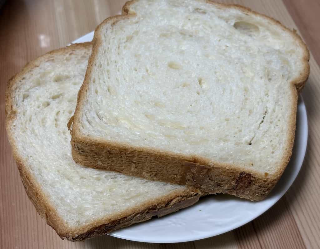 袋を開けるとバターがふわっと香ります。トースターで焼く前は普通のパンっぽいですが、焼くとサクッとしてクロワッサンぽくなるので焼く方がおすすめです。バターの風味がして美味しく、クロワッサンと食パンの中間くらいのサクッと感とバター感でした。1枚の大きさは通常の食パンより若干小さめで、8枚切りとほぼ同じくらいの重さでした。なので朝食なら1枚だけだと少し物足りないかなという感じです。通常のパンより日持ちするのはありがたいポイントです。