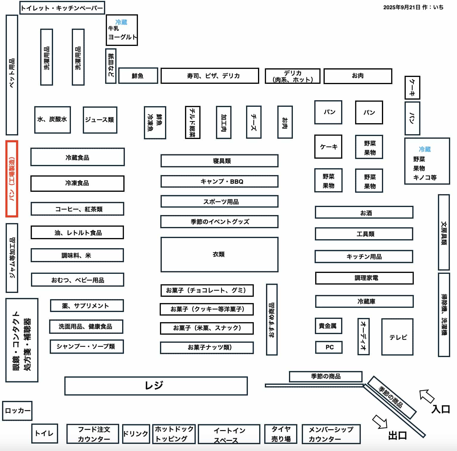 ハワイアンスイートロールは2024年12月時点ではディナーロールの場所ではなく、パン(工場製造)売り場の近くで売っていました。店内マップは滋賀県の東近江倉庫店のもので、個人作成なので参考程度にご覧ください。