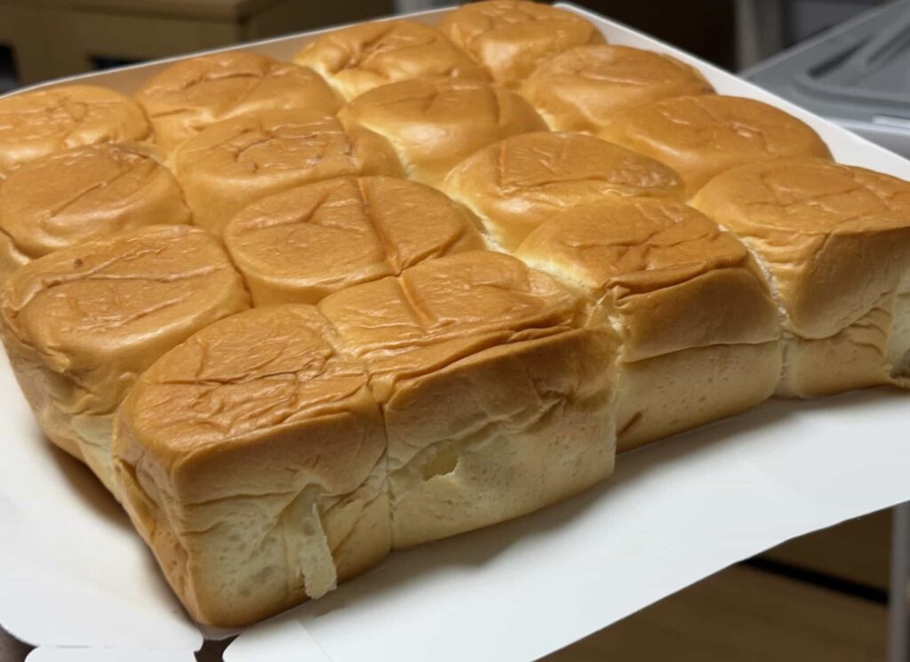 ケースの中に4×4個のパンが入っております。1個5~6cm角くらいの大きさで、ディナーロールと同じくらいの感覚です。感触はふわふわしております。