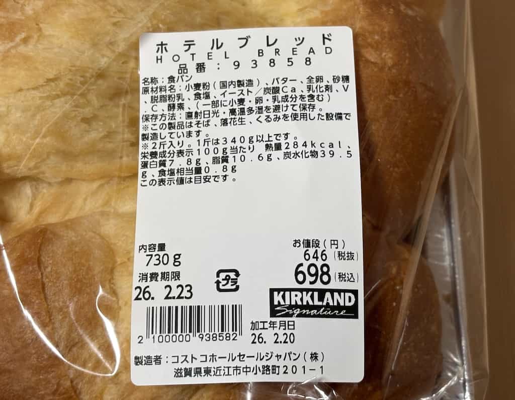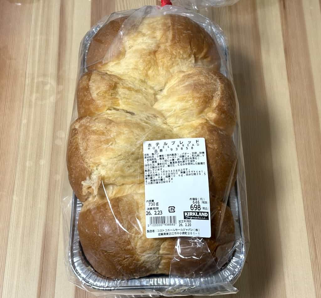 コストコで売っているホテルブレッドはたっぷりのバターを使用したホテルの朝食に出てくるような食パンで、ふわふわでそのままでもかなり美味しいです。バターの香りが良く、卵の風味も少し感じられます。焼いて食べるのもおすすめです。1斤約349円と、普通の食パンに比べると割高感はありますが、美味しさを考えると納得できます。ふわふわなので切り分けにはブレッドナイフなどの使用をおすすめします。
