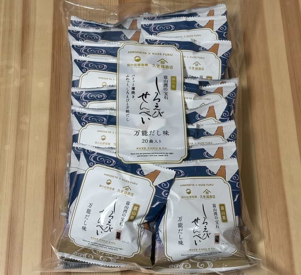 富山湾で採れる白えびを使用した煎餅に久世福の万能だしを加え、小腹が空いた時のおやつやおつまみにぴったりの風味豊かな煎餅です。