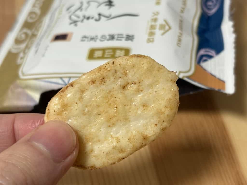 食べた瞬間万能だしの風味がしっかりして、後からほんのりエビの風味と旨味が来るように感じました。ありそうでなかった味の煎餅で非常に美味しいです。魚の風味もあり塩気が少しあるので、おつまみとしても相性が良いと思います。だしの粉が少し指に付きますが、一口サイズなので食べやすく、小腹が空いた時にぴったりです。