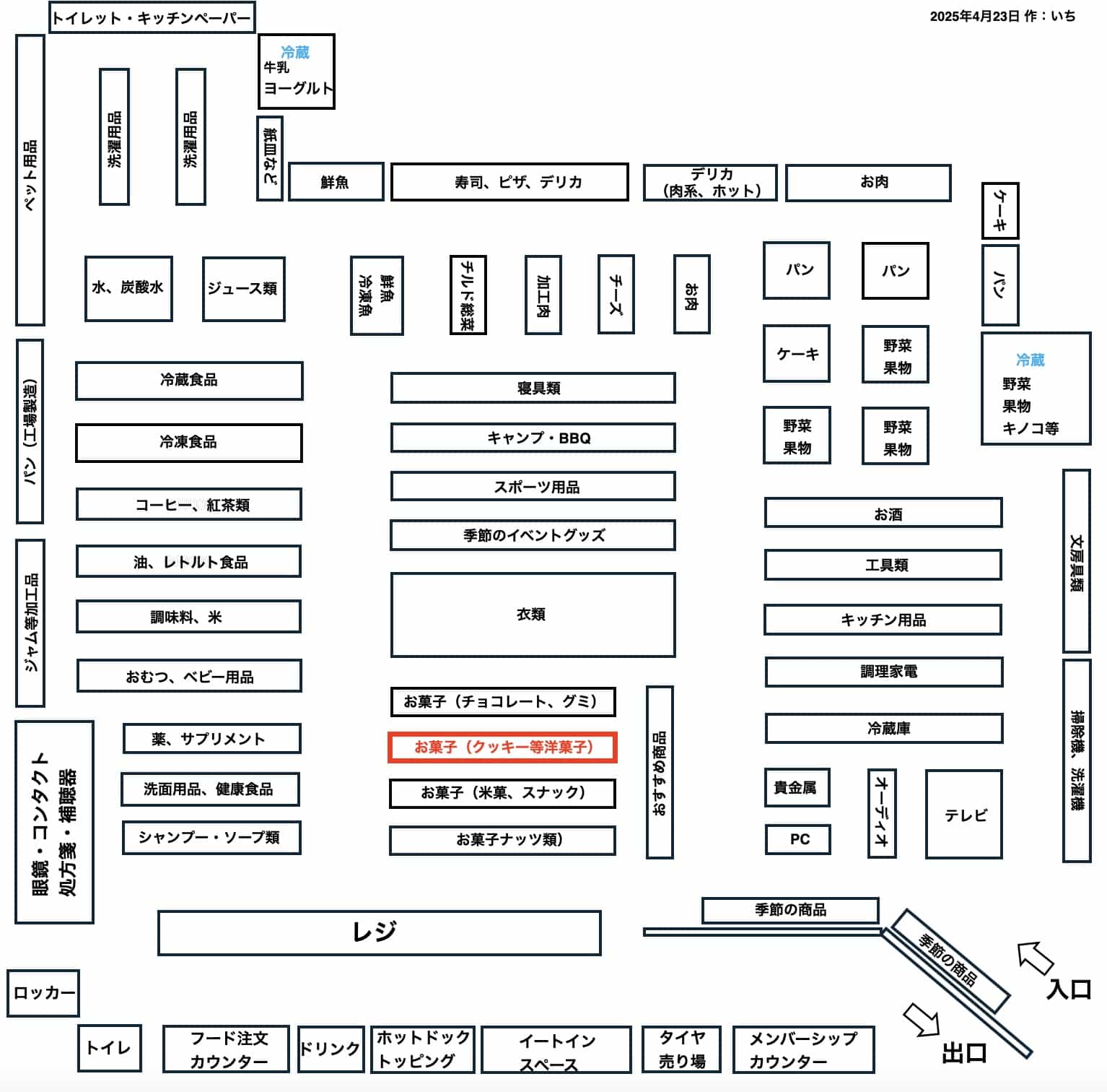マカダミアポップコーンクランチは2024年12月時点では以下の場所で売っていました。店内マップは滋賀県の東近江倉庫店のもので、個人作成なので参考程度にご覧ください。