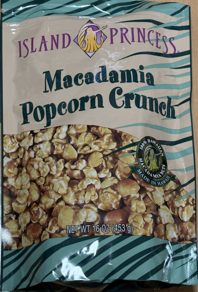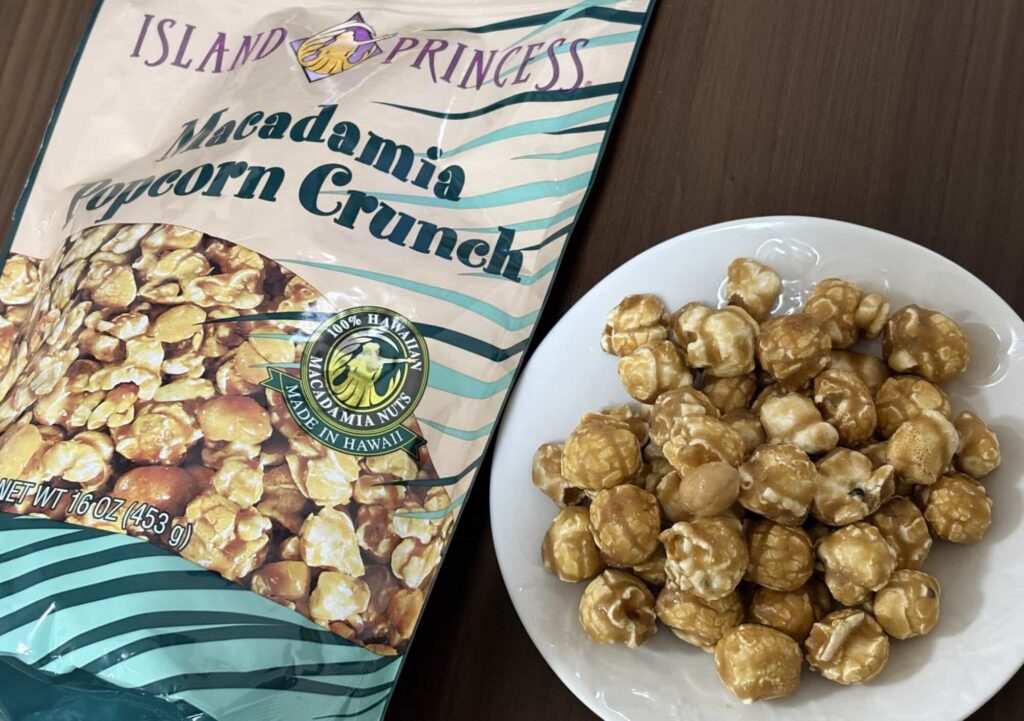 マカダミアポップコーンクランチはハワイで作られた、キャラメル風味のシロップがたっぷりかかったポップコーンです。