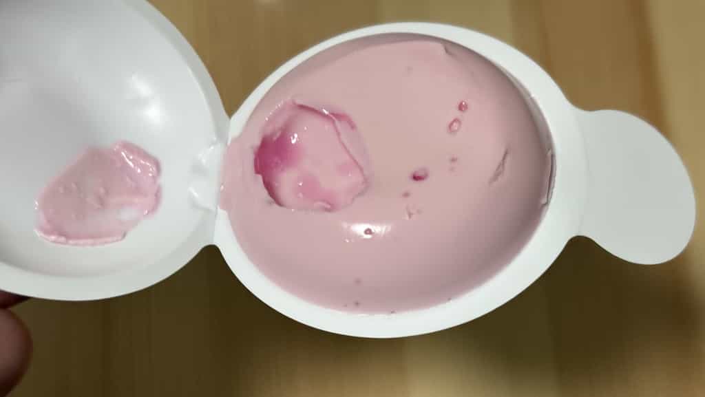 直径約4cmほどの丸い形が特徴です。個包装で密閉しており、パカっと開けると表面ツルツルのチーズが出てきます。ストロベリー風味の見た目はピンク色で、天然由来の着色料が使用されております。