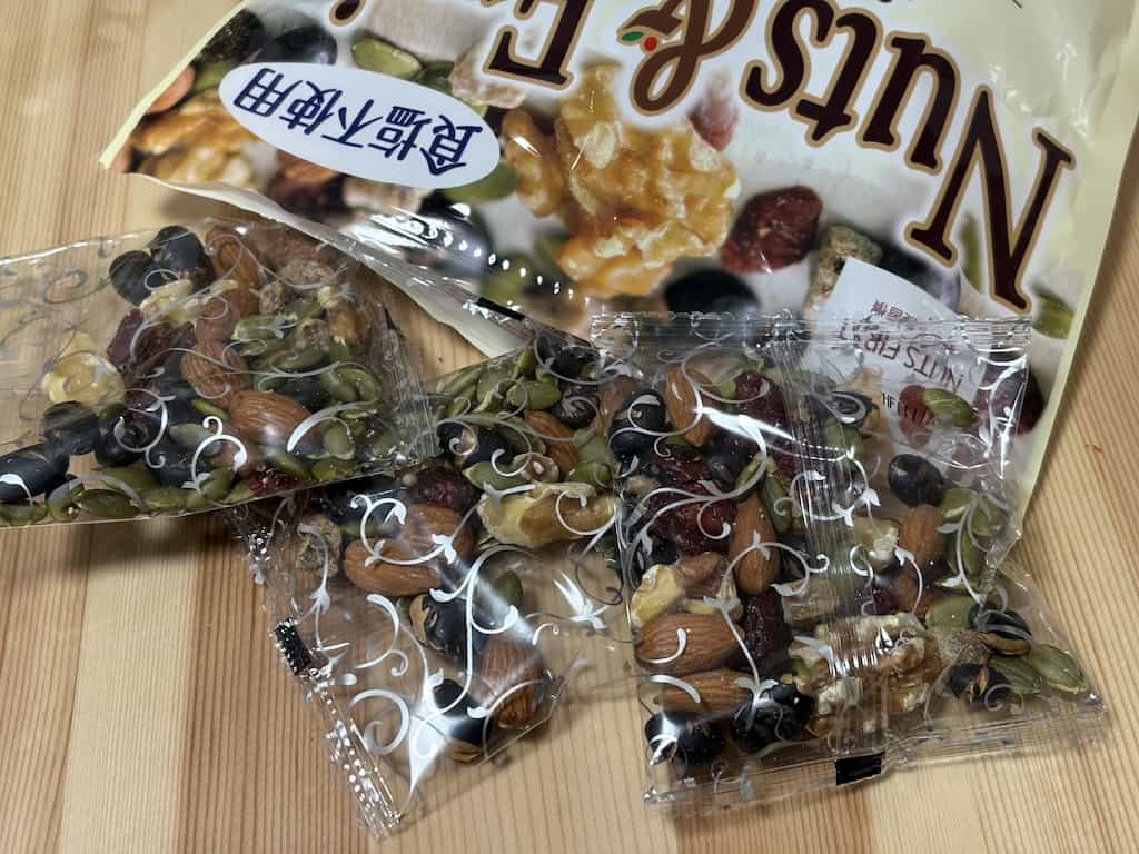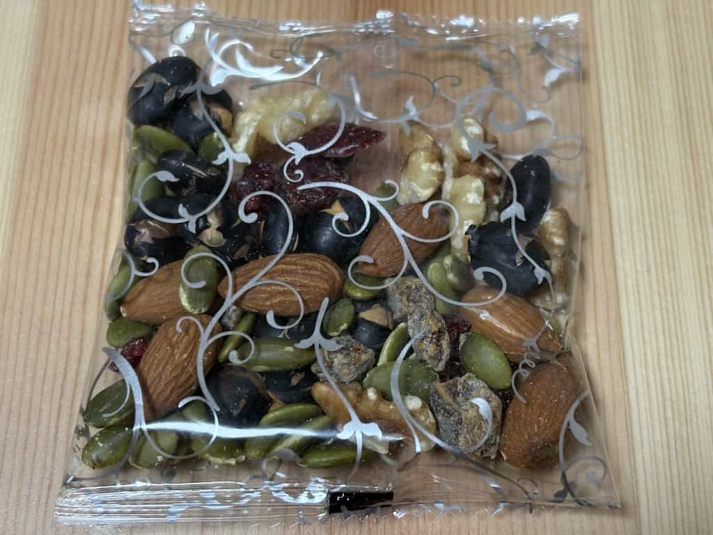 個数的にはナッツ類が多めで、乾燥いちじくとクランベリーは少なめです。塩気はほぼなく、素朴な味わいで美味しいです。それぞれ食感が異なるので飽きずにパクパクと食べてしまいます。おやつや小腹が空いた時にピッタリです。罪悪感が無いので夜中に食べてもいいような気がします。