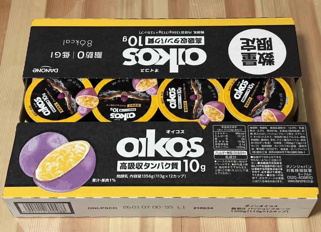 オイコスはタンパク質が豊富に含まれたプロテインヨーグルトで、脂肪ゼロ、血糖値の上昇を穏やかにする低GIが魅力です。数量限定でパッションフルーツ味が登場しました。