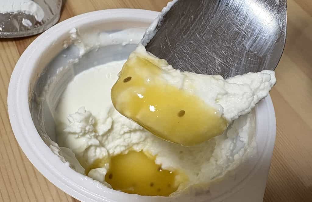 コストコで売っているオイコスのパッションフルーツはさっぱりとしたギリシャヨーグルトと甘さ控えめのパッションフルーツ果汁が入ったソースで、パッションフルーツの種は入っておらず粒々感はあまり無いですが、美味しくタンパク質が摂れます。コンビニやスーパーよりもかなり安く買えるので非常にコスパは良いと思います。