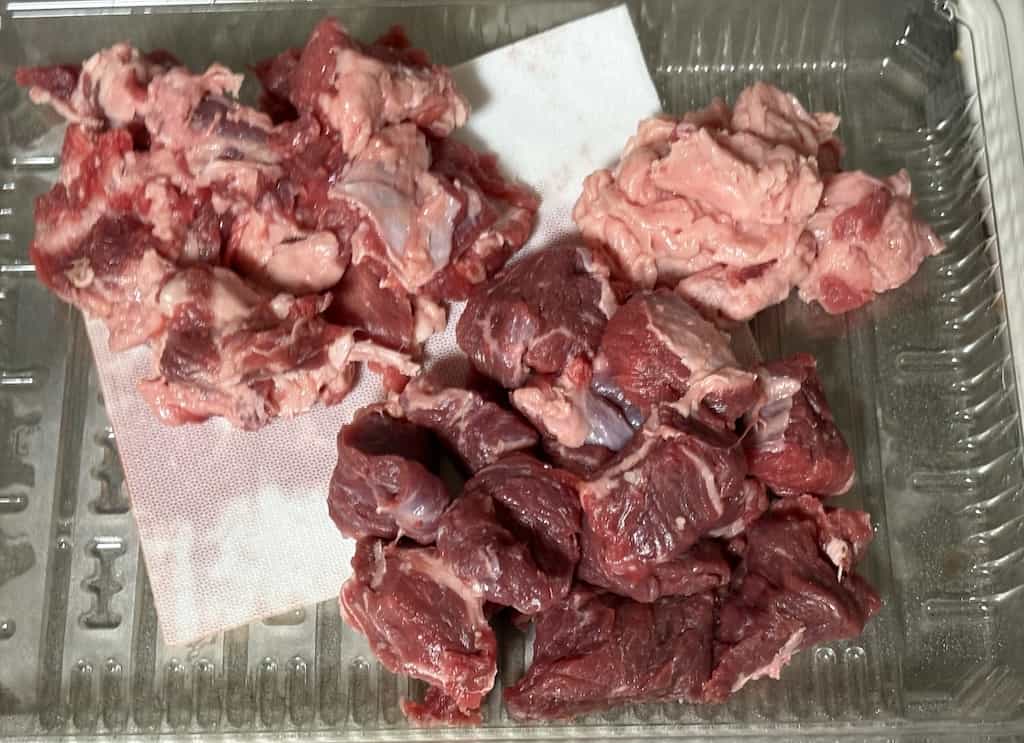 下部の赤身は少し硬めのロースなので煮込み料理に向いてます。白い部分は筋や牛脂で、筋は煮込み、牛脂はステーキや炒め物で最初に引く油として使えます。