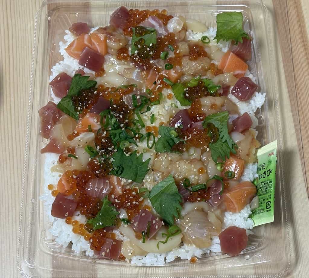 2025年12月現在に販売されているちらし寿司には、いか、サーモン、まぐろ、えび、鯛、いくらの6種の海鮮が入ったちらし寿司になっております。