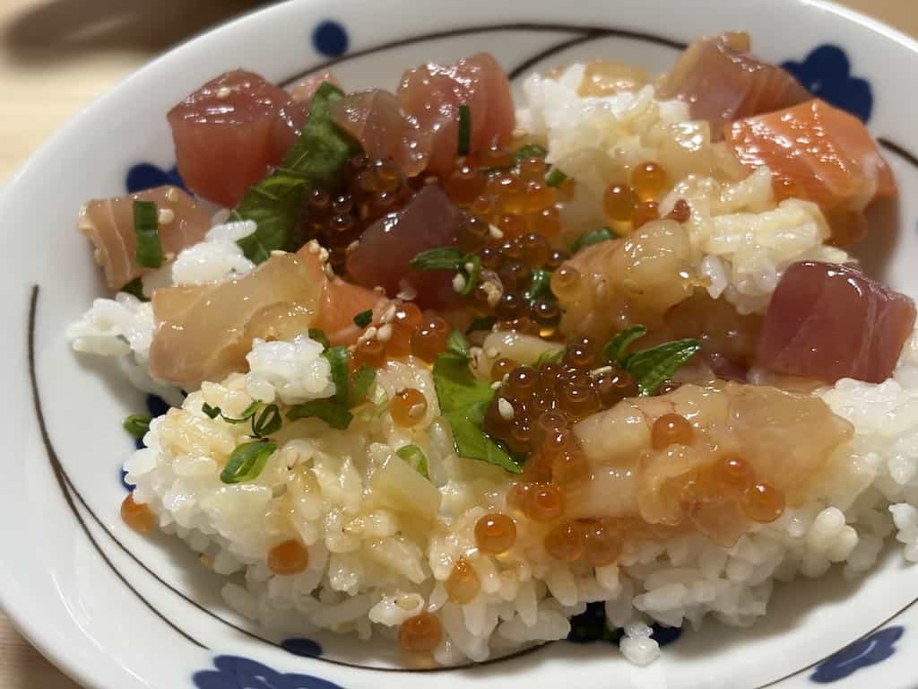 いか、まぐろ、サーモン、鯛、えび、いくらはどれもプリっとして美味しいです。ほんのりごま油が感じられ、醤油も濃すぎず具材の美味しさが感じられるちょうど良い味付けでした。3人で食べるとちょっと少ないかなと感じたため、海鮮ちらしメインで食べるなら量は2人前くらいだと思います。パーティーだと結構映えそうですが、複数人いるとあっという間になくなる量です。