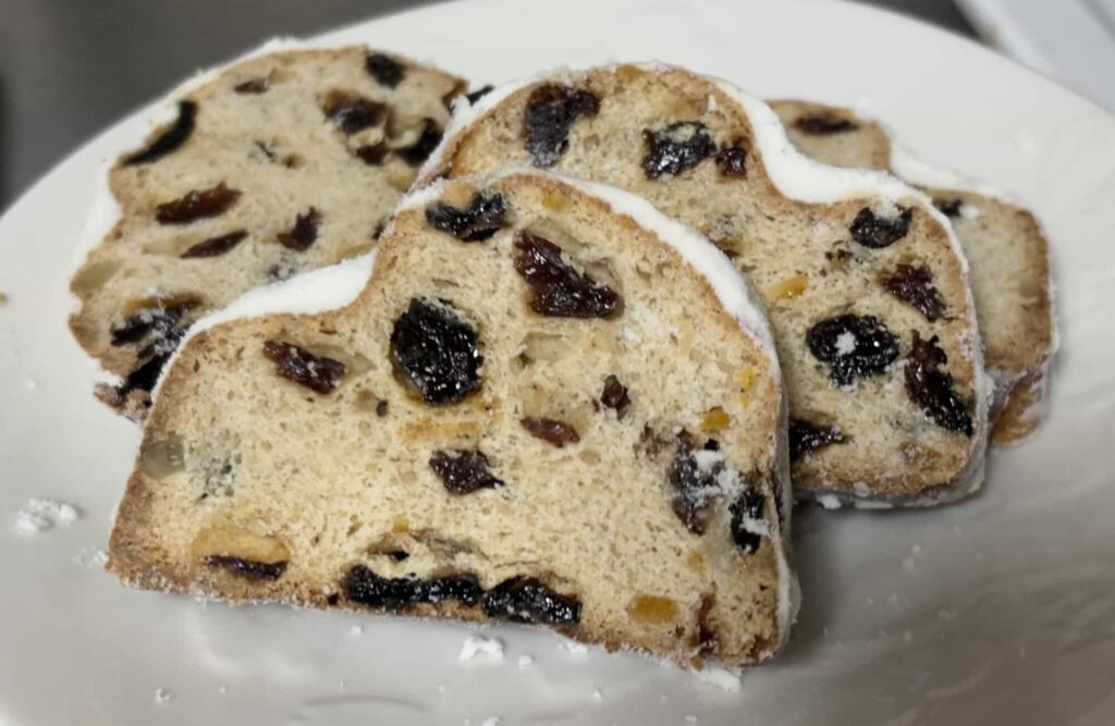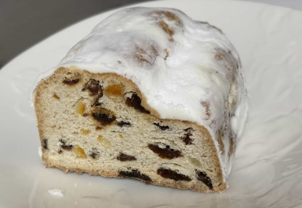周りの粉砂糖は甘いですが中身はそれほど甘くなく、バターの香りと主にレーズンの食感がクセになる美味しさです。焼き菓子のような菓子パンのような中間くらいの印象です。日本のお菓子とは違った風味でおすすめできます。ずっしり感があるので自分は1/3本で満足できました。