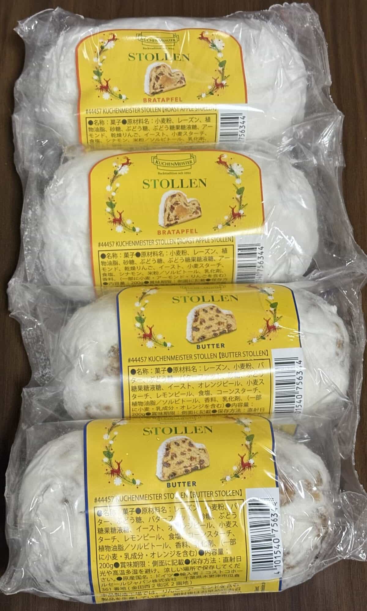 シュトーレンはドイツでクリスマスを迎えるために食べられる伝統的なお菓子で、現地では少しずつ切って食べていくそうです。バター風味とレーズンなどのドライフルーツがたっぷり入っているのが魅力です。コストコではバター、焼きリンゴの2種が2本ずつ入っていました。