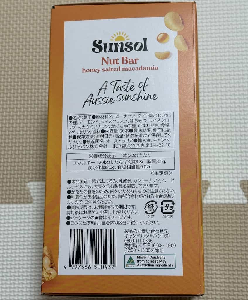 Sunsol(サンソール)というオーストラリアのブランドから発売されており、高タンパク質、グルテンフリーのナッツバーです。