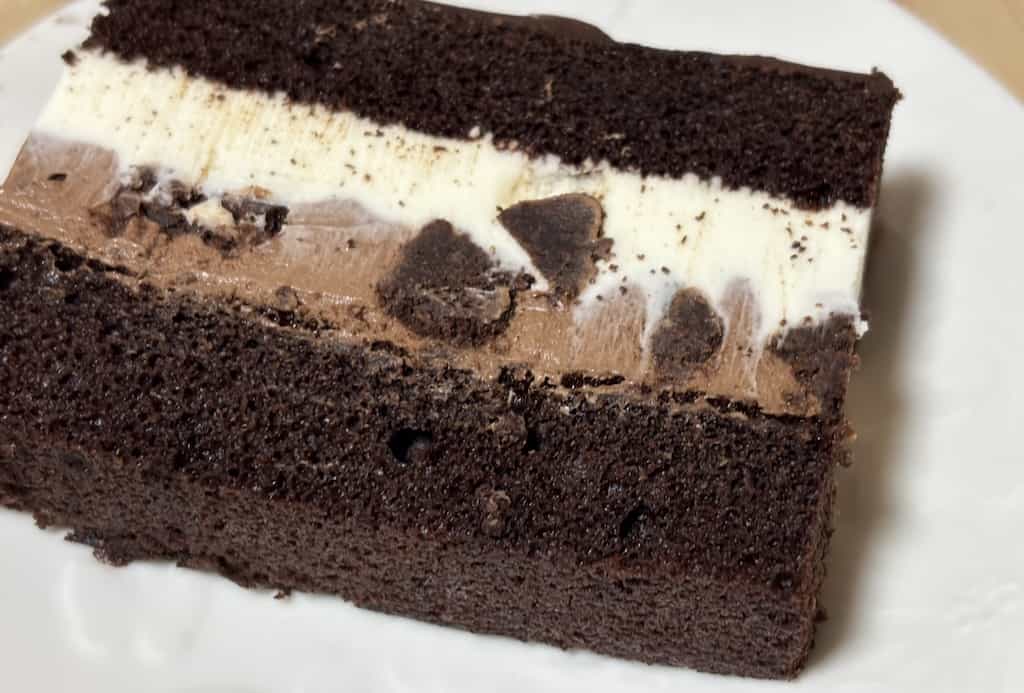 上から順にチョコレート層、ビターなチョコスポンジ層、白いマスカルポーネチーズ層、チョコムース層となっており、間にチョコブラウニーがごろごろ入ってます。